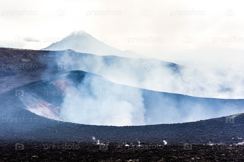 Дымящийся кратер извергающегося вулкана Толбачик, Камчатка