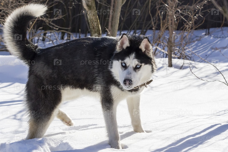 Большой хаски гуляет по зимнему лесу