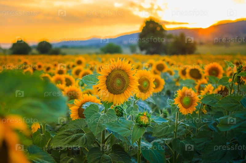 Красивое поле подсолнухов на закате в летний день