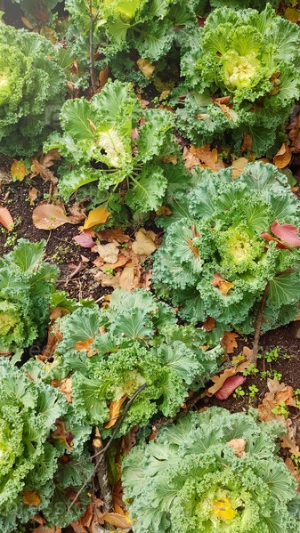 Осенью на грядке растет красивая декоративная капуста