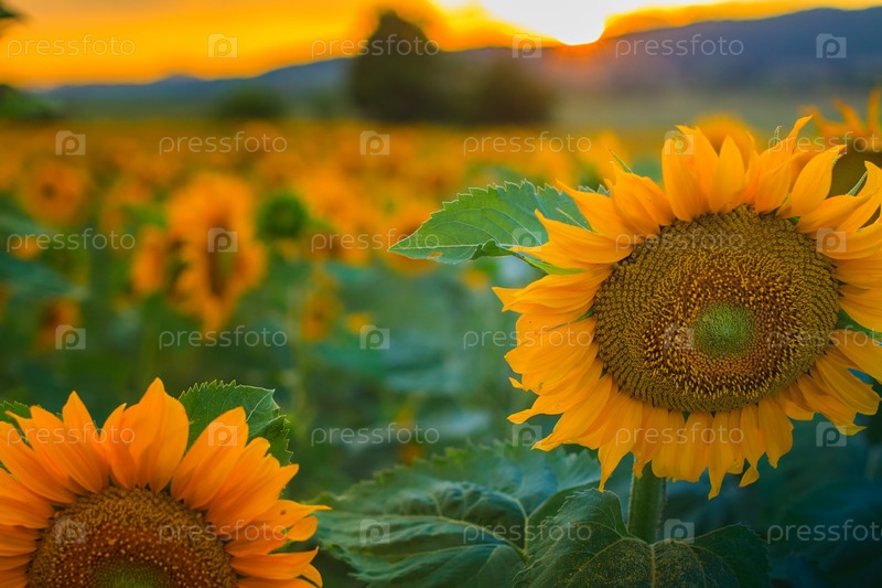 Крупным планом цветов красивое поле подсолнухов на закате