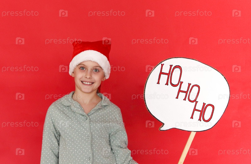 Веселого Рождества и счастливого Нового года. Милая маленькая девочка в шляпе Санты держит доску с текстом хо-хо-хо