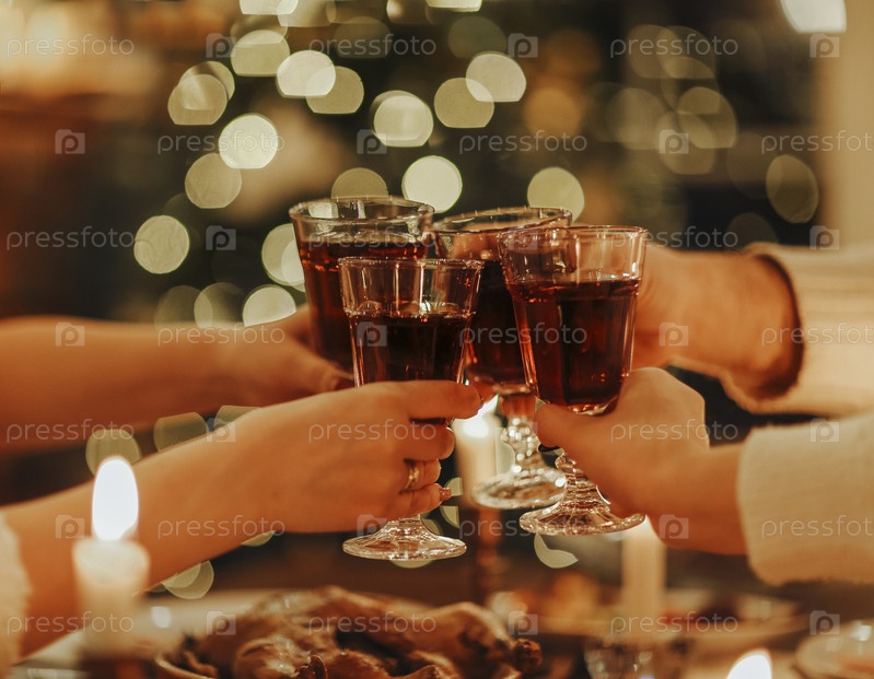 Друзья семьи веселятся вместе зимой, поедая еду на деревянном столе