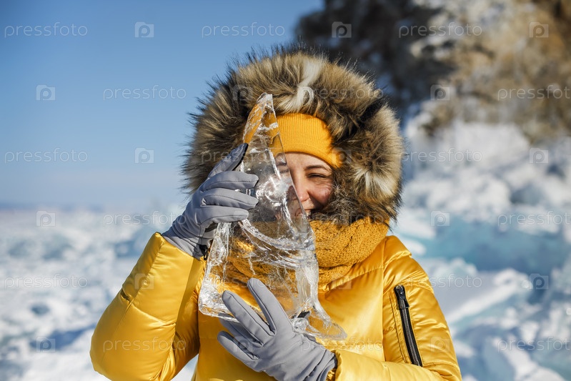 Счастливая женщина в зимней желтой куртке держит на лице кусок прозрачного дробленого льда
