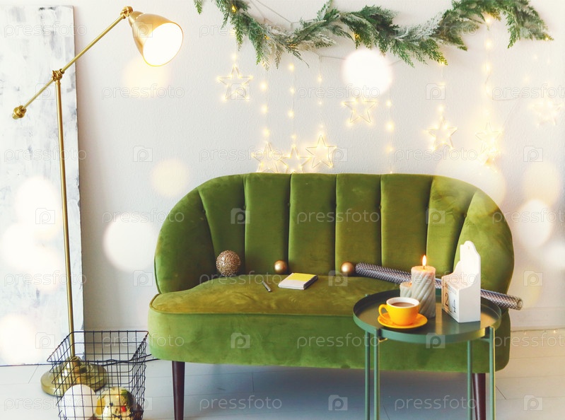 Зеленый велюровый диван у белой стены, украшенный гирляндой из еловых веток и рождественскими огнями