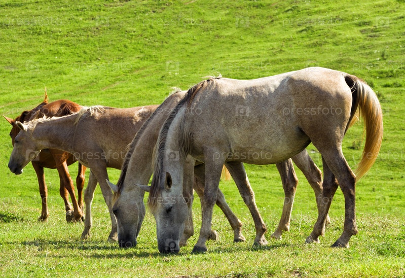 Группа белых лошадей, пасущихся на фоне зеленых пастбищ