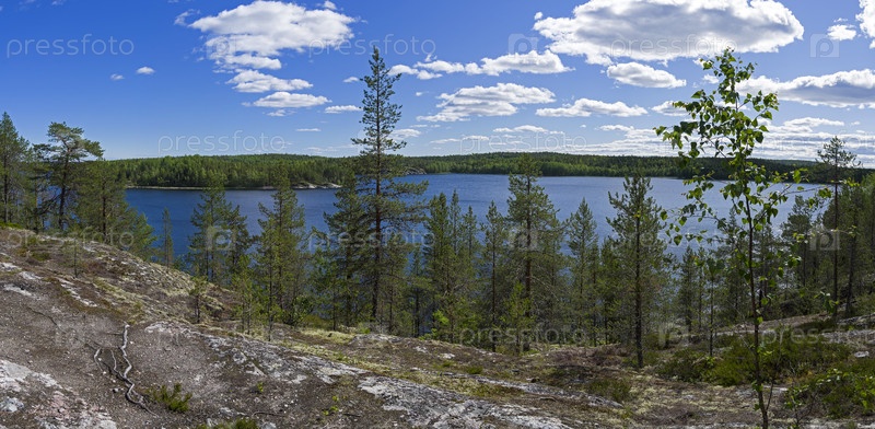 Сосны на высоком скалистом берегу Белого моря. Кандалакшский залив, Чупинская губа, Остров Олений. Карелия, Россия, конец июня