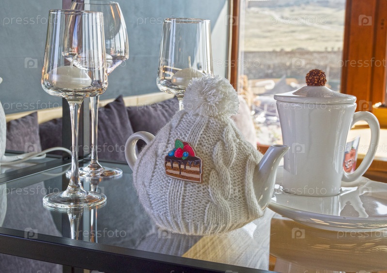 Забавное украшение интерьера кофейни - заварочный чайник в вязаной шапочке с помпоном