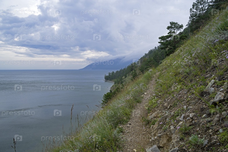 Берег озера Байкал, облака скрывают прибрежные горы. Вид с Большой Байкальской тропы, август