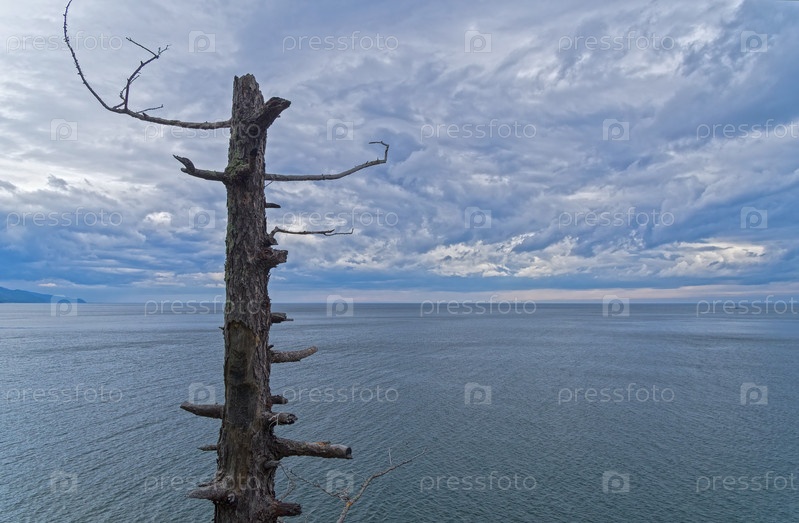 Ствол засохшего дерева на фоне красивой облачности над озером Байкал. Иркутская область, Россия. Август