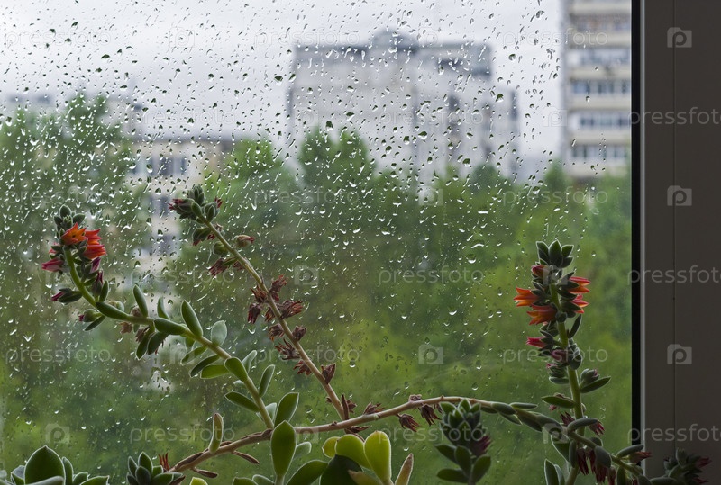 Цветущий очиток на фоне окна, покрытого каплями дождя