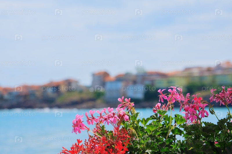 Ярко-розовые цветы растут с видом на море