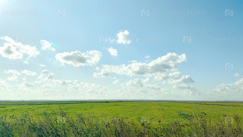 Зеленое поле и светло-голубое небо с белым облаком