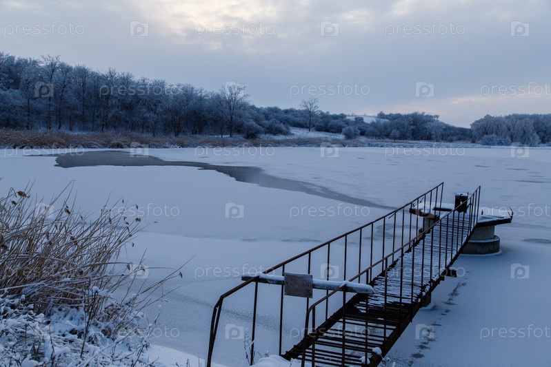 Металлический пирс на озере, покрытом льдом на закате