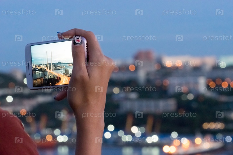Рука девушки со смартфоном фотографирует Золотой мост. Владивосток, Россия