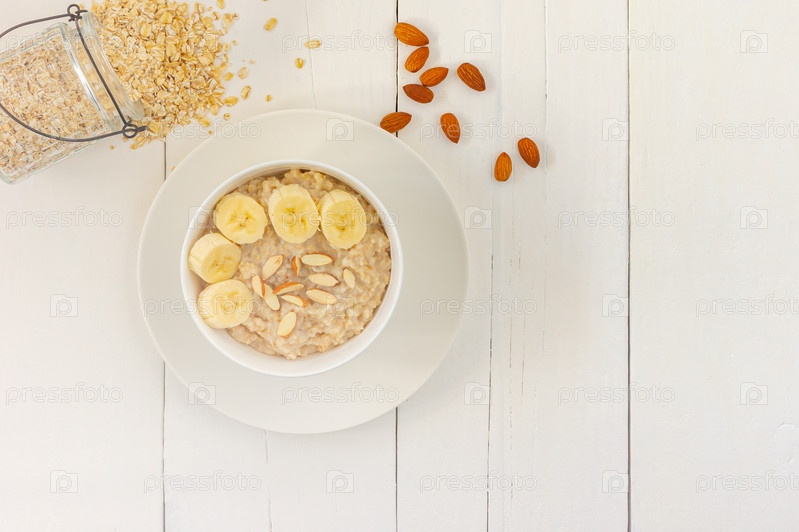 Вид сверху на миску овсяных хлопьев с нарезанным бананом крупным планом на деревянном столе