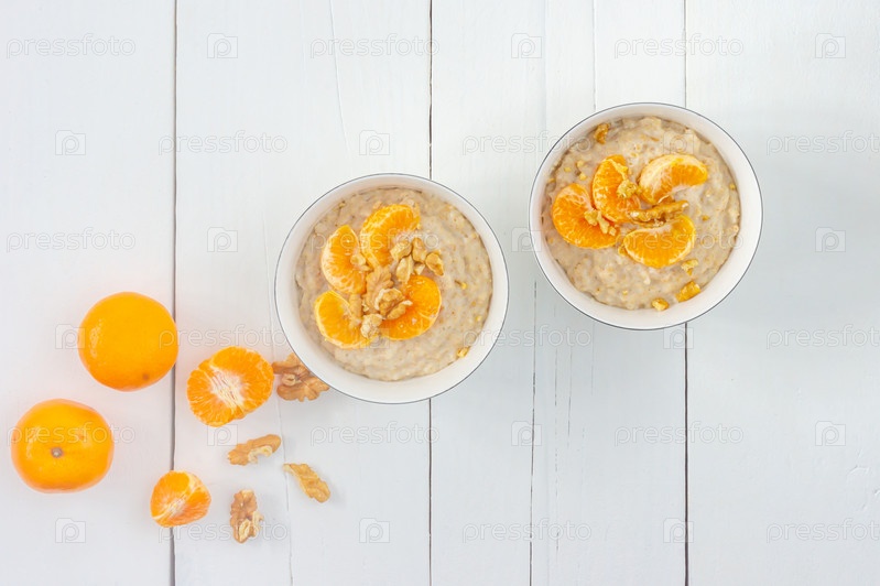 Легкая калорийная каша. Овсянка с сочными мандаринами и семенами льна без льна в мисках на мешковине, на белом фоне. Рецепт низкокалорийной каши