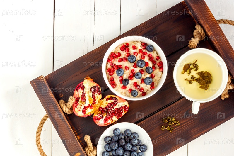 Здоровая овсянка на завтрак с гранатом, черникой и чашкой зеленого чая, сцена над головой на белом деревянном столе