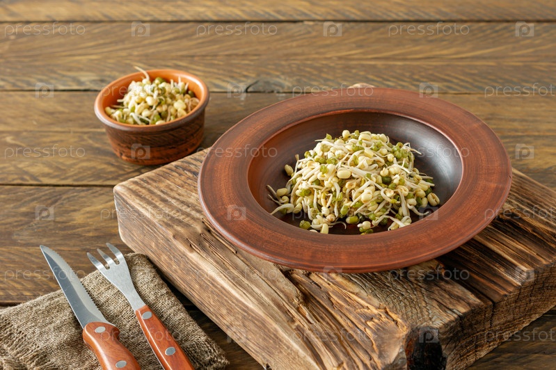 Пророщенная еда. Проросшие бобы в тарелке на деревенском деревянном фоне. Макробиотики
