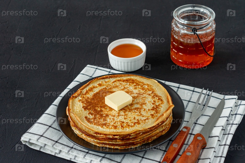 Блины подаются с медовым сиропом и маслом на темной тарелке. Традиционные блинчики на масленицу или масленицу