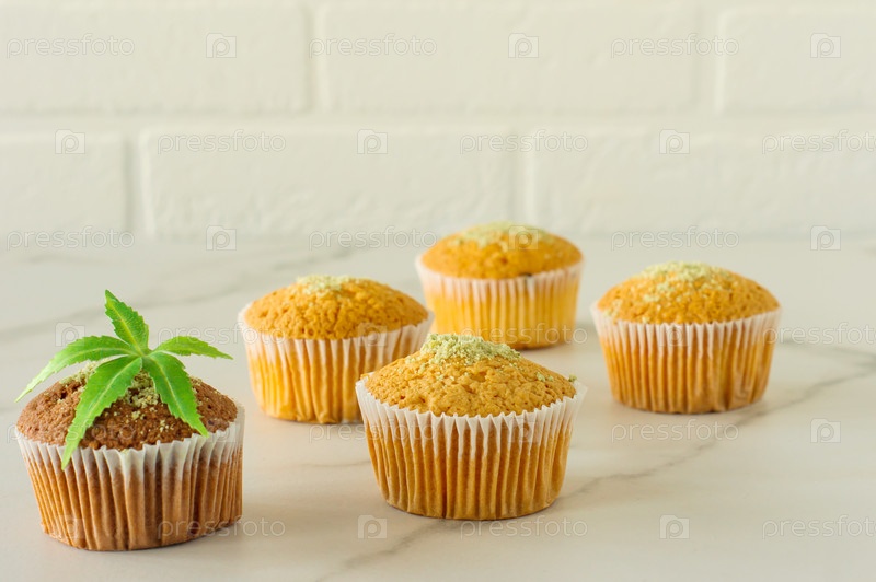 Здоровые и вкусные веганские и безглютеновые кексы с семенами конопли на мраморном столе. Кексы с марихуаной и листьями конопли