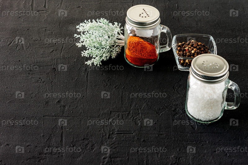 Шейкеры для перца и соли на черном бетонном фоне с копией пространства