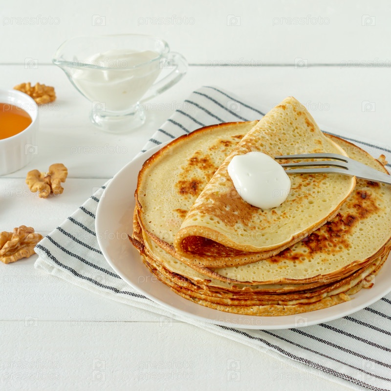 Блинчики с медовым сиропом и сметаной на белой тарелке. Традиционные блинчики на масленицу или масленицу