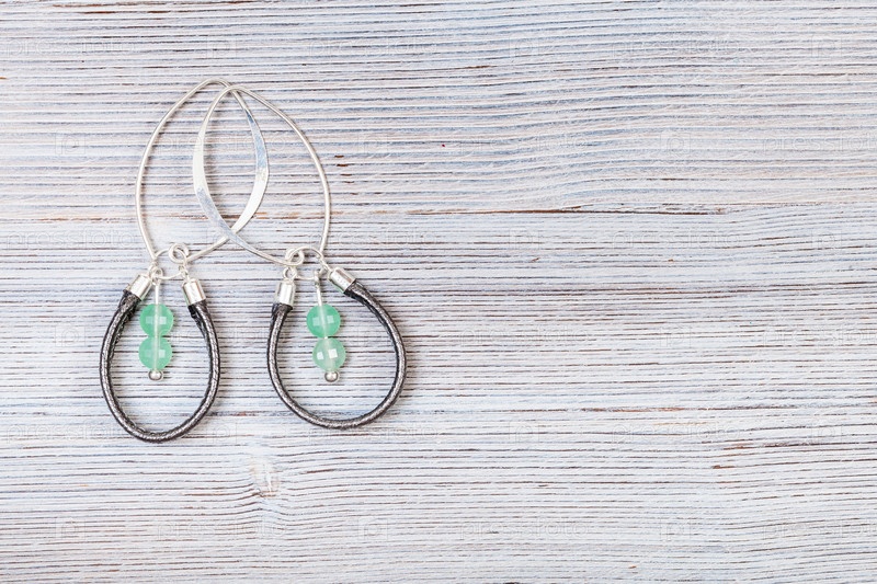 Серьги из зеленого нефрита и кожаного шнурка на сером