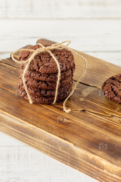Домашнее шоколадное печенье на фоне деревянного стола. Выпечка еды