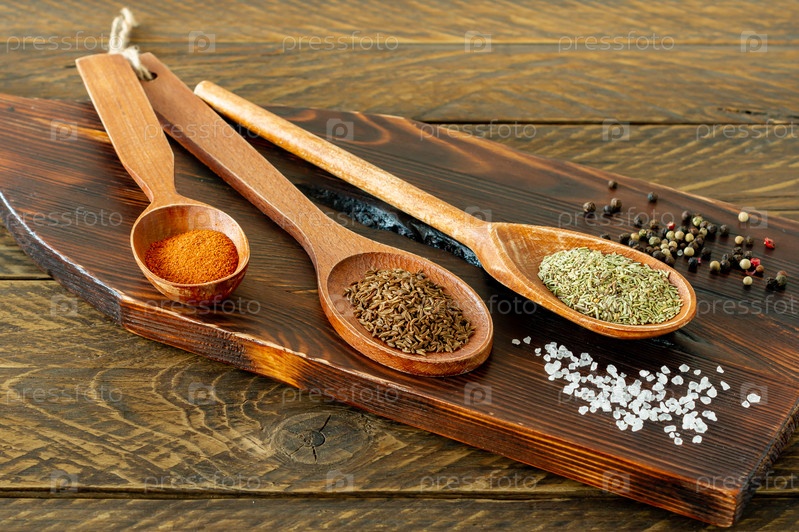 Крупный план ярких специй перца, паприки, шафрана, перца в деревянных ложках