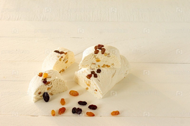 Нарезанная халва с орехами и сухофруктами на тарелке с цветами и фруктами на белом столе
