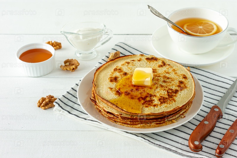 Блины подаются с медовым сиропом и маслом на белой тарелке. Традиционные блинчики на масленицу или масленицу