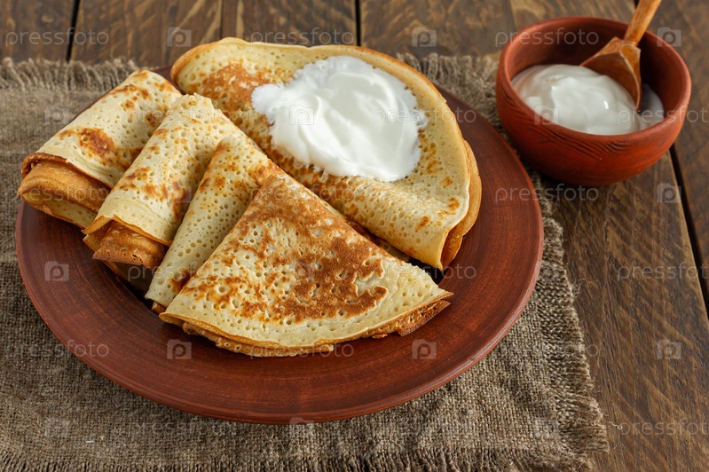 Стопка блинов или блинов на тарелке со сметаной. Традиционное блюдо русской масленичной недели. Деревянный фон