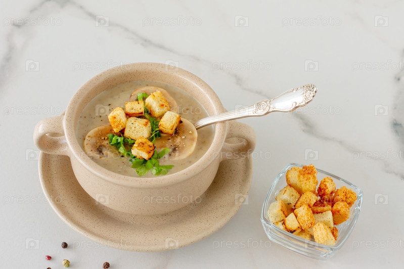 Грибной крем-суп с травами и специями в коричневой миске на мраморном столе