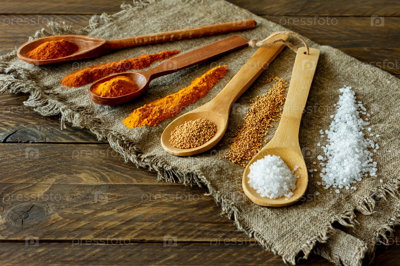 Ассортимент специй в деревянных ложках на мешковине на деревянном фоне