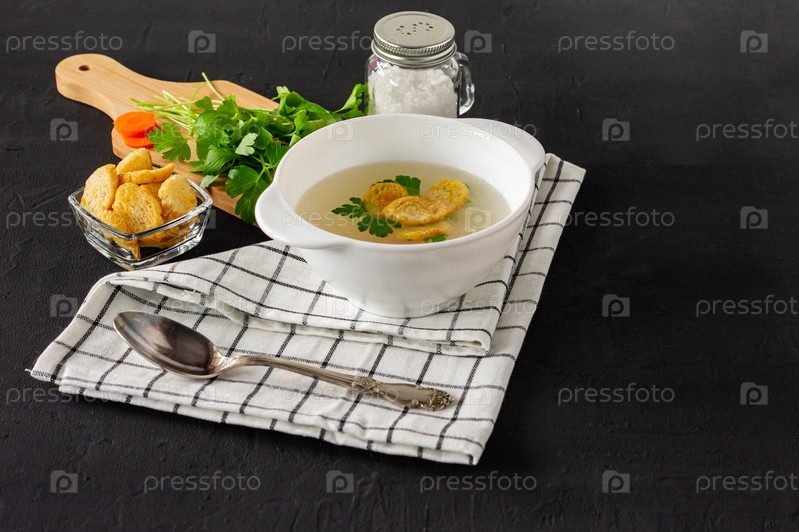 Домашний куриный бульон или бульон. здоровый ужин. черный бетонный фон