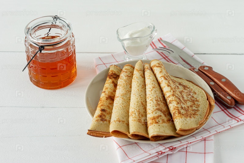 Блинчики с медовым сиропом на белой тарелке. Традиционные блинчики на масленицу или масленицу