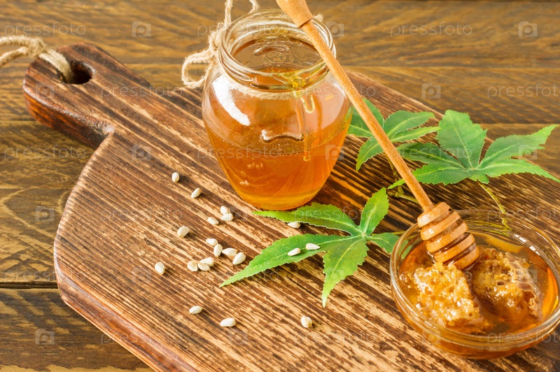 Свежий органический мед с более глубокими листьями и семенами конопли на деревянном столе. Здоровое питание альтернативная медицина