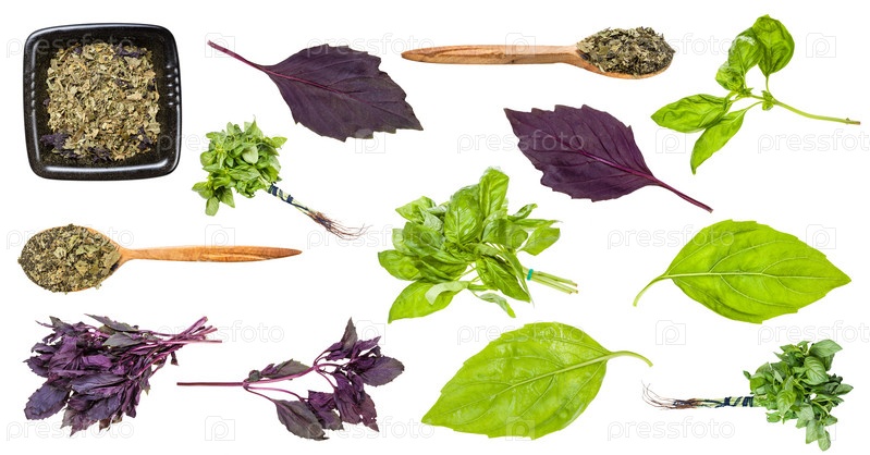 Набор различных трав базилика, изолированных на белом