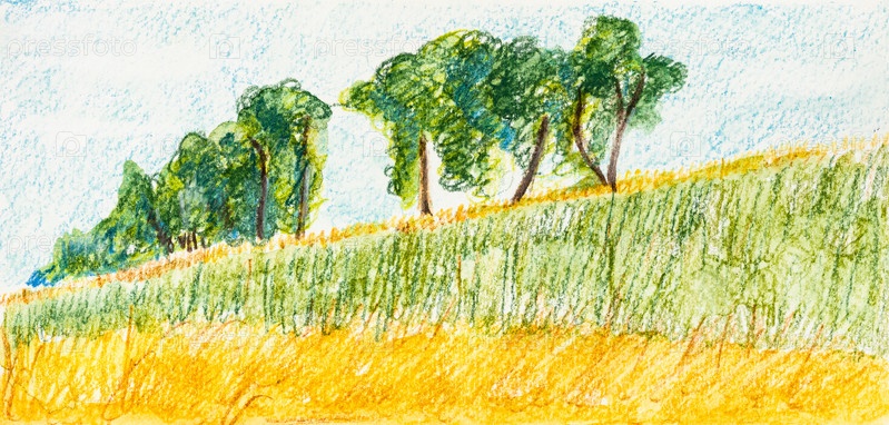 Эскиз пейзажа с деревьями на холме и поле