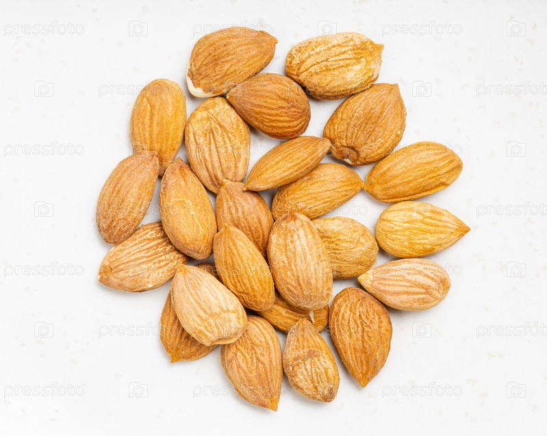 Куча сырых абрикосовых косточек крупным планом на сером