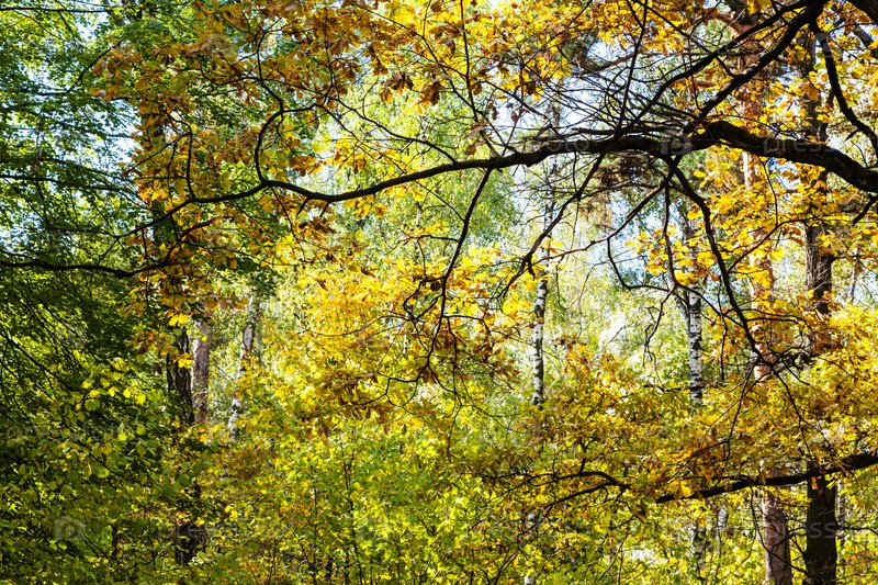 Дубовая ветвь, освещенная солнцем в густом лесу осенью