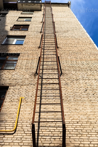 Вид снизу пожарной лестницы на крышу кирпичного дома