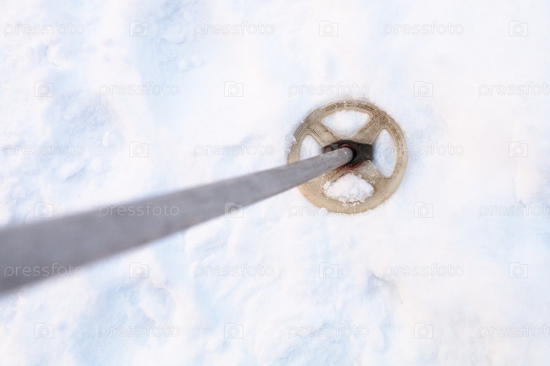 Вид сверху на старую лыжную палку в снежном поле