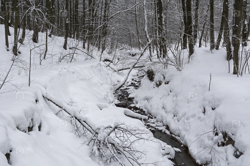 Незамерзающий ручей в зимнем лесу