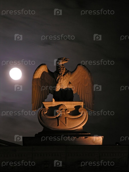 Скульптура расправившего крылья орла на фоне ночного неба. Париж, Франция