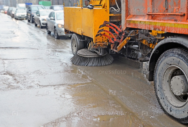 Подметальный комбайн в пробке во время дождя