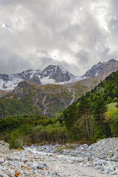 Горная река в Осетии, ледник Тана в горах. Кавказские горы
