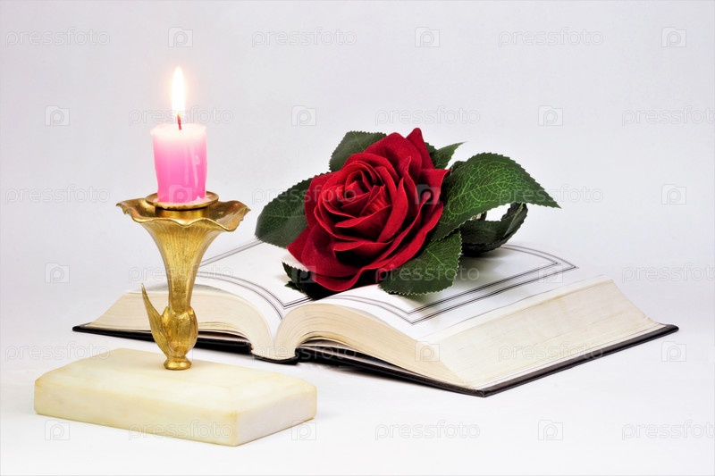 Книга открыта, красная роза украшение для творческого праздника и старинная свеча дает свет
