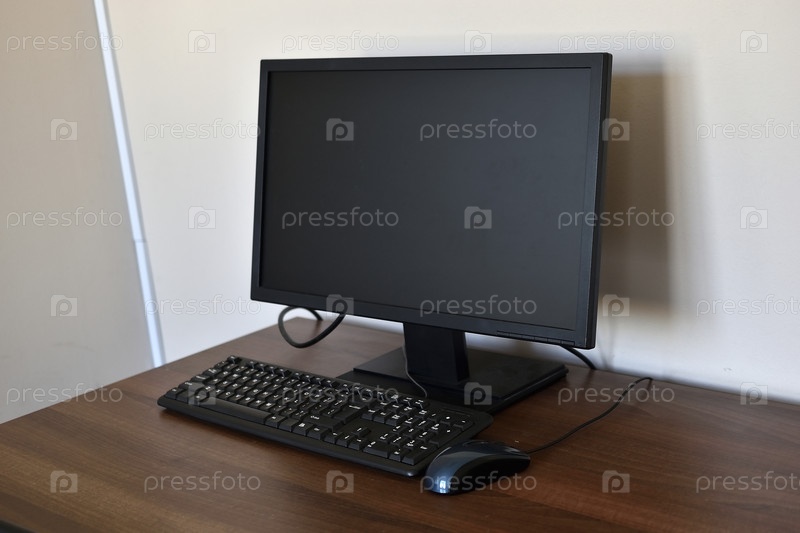 Персональный компьютер на столе в офисе. Следите за клавиатурой и мышью на столе
